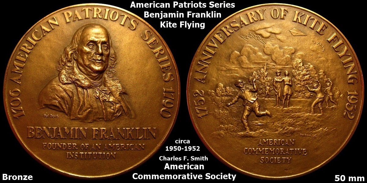 The reverse reads 1752 ANNIVERSARY OF KITE FLYING 1952 AMERICAN COMMEMORATIVE SOCIETY with what appears to be Franklin flying a kite with onlookers. There is lightning in the sky.