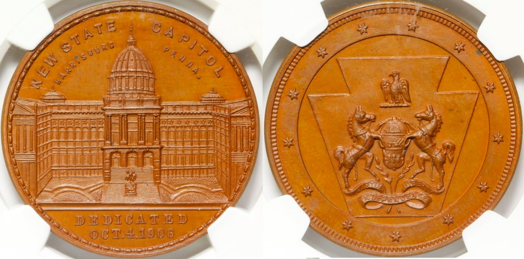 Quote from Kevin Himber on December 10, 2016, 1:39 pmThis piece measures 36 mm and is 90% (coin) Silver. I believe that it is an Official Strike from the Ceremony presided over by President Theodore Roosevelt on October 4th, 1906 Dedicating the New Capitol Building at Harrisburg, Pennsylvania. It is looped and attached to a black ribbon. I have never seen this piece before does anyone have any further information on this piece?