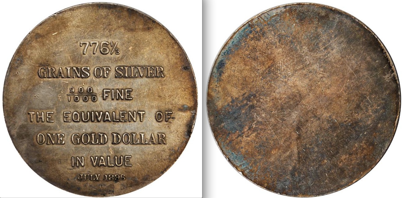 There are many Bryan Dollars in the series, with an entire book written on Bryan Dollars by Fred Schornstein (Copyright 2001 by TAMS). In his book, he mentioned one medal that I obtained recently (HK-1010), a 49mm silver uniface piece made by Tiffany & Co and sold by the E. Jaccard & Co (see page 2 of Schornstein's book). My piece does not have any edge markings. Per the NGC census, only 1 without edge markings is graded (an MS-64) as described in the HK book. Apparently 5 other similar pieces are graded but also happen to be edge marked with Tiffany & Co on the edge, but are still reported as HK-1010 but with edge markings? which I think should be HK-777 and 778 pieces. The Schornstein book does mention Schornstein-1 pieces with similar obverse wording and with edge marking of Tiffany & Co (7 1/2mm) and later 1910 restricts with 8mm edge lettering. Unfortunately, I don't have any good photos of the edge-lettering differences but would like to see some. I will post some additional photos of HK-1010 pieces? which do not appear to be Schoenstein-5 pieces (similar pieces missing the July 1896 date on the obverse). Does anyone have edge photos on slabbed HK-1010 or HK-777 / 778 pieces??