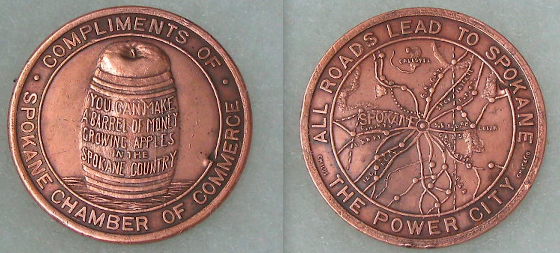 I own an HK-728 so-called dollar (image below). In the H&K reference book, this item is not attributed to anything and is listed as "undated." Recently, I ran across a "Spokane Day" medal (image below) from the 1909 Alaska-Yukon-Pacific Exposition that has an identical reverse. Seems to me that HK-728 is a medal related given out by the Spokane WA Chamber of Commerce to advertise Spokane... and perhaps later may have been distributed at the 1909 AYP exposition. Jeff & Bill, do you agree? Thoughts from anyone on this?
