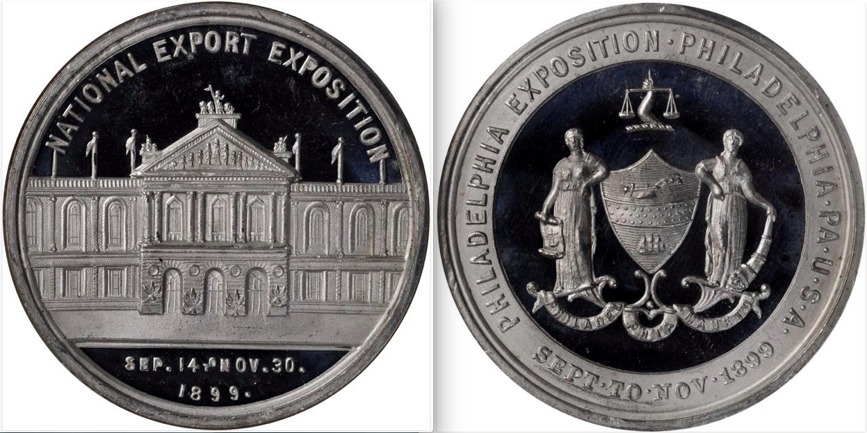 The National Export Exposition held in Philadelphia in 1899 encouraged trade between the US and foreign countries. The Philadelphia Commercial Building is featured on the obverse of HK-644, and the city seal is on the reverse. HK-644 is known in bronze and white metal.