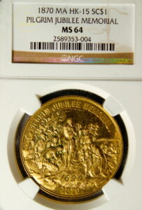 This was struck in 1870 to commemorate the 250th anniversary of the Pilgrim’s voyage on the Mayflower and their landing at Plymouth Rock. A scene of Pilgrims saying a prayer for gratefulness is on the obverse; the Holy Bible is open on the reverse. Gold-Plated.